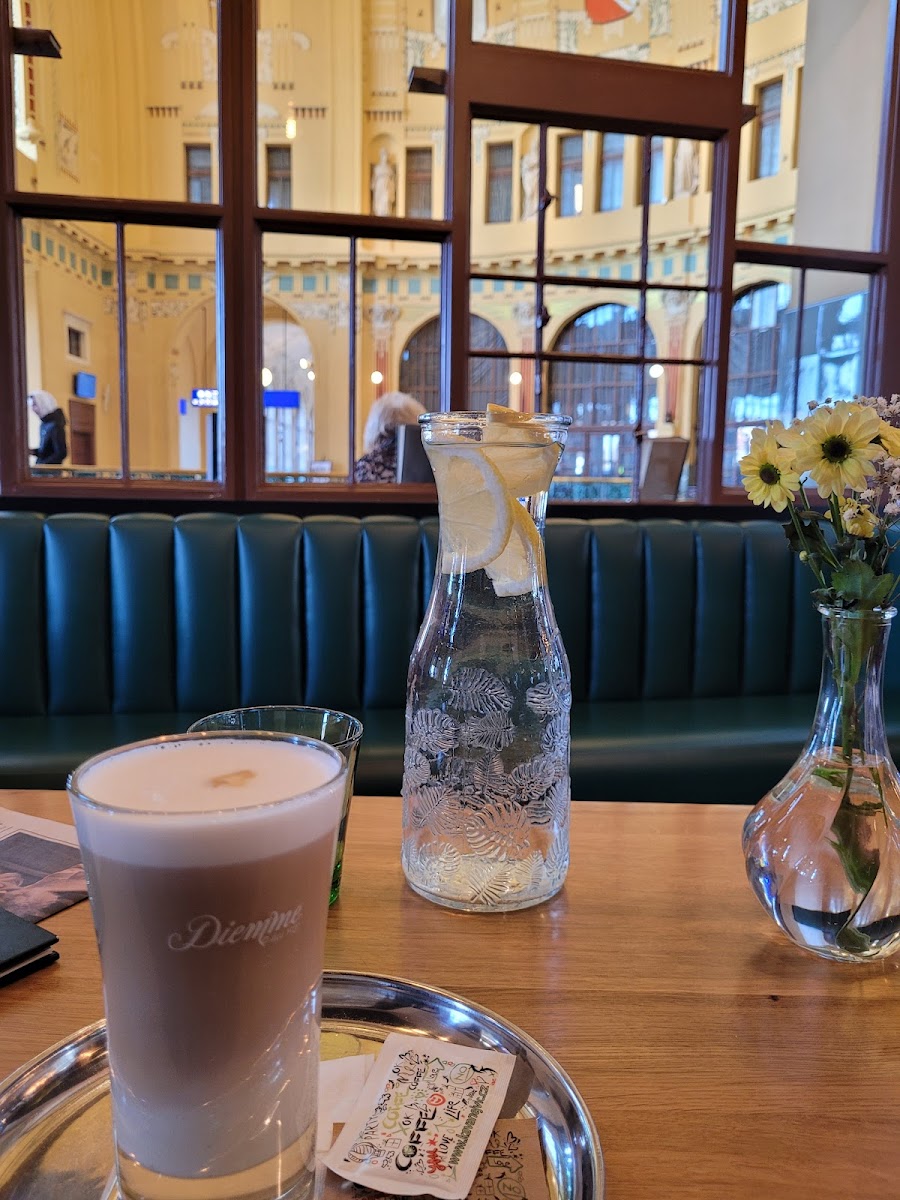 If you have some time at the train station and want a good coffee, this is the perfect spot. The cozy design inside the historical building makes the atmosphere really special. It also works great for meetings – I often meet clients here when they travel to Prague, or just wait for someone at the station. Always a good place with good coffee.